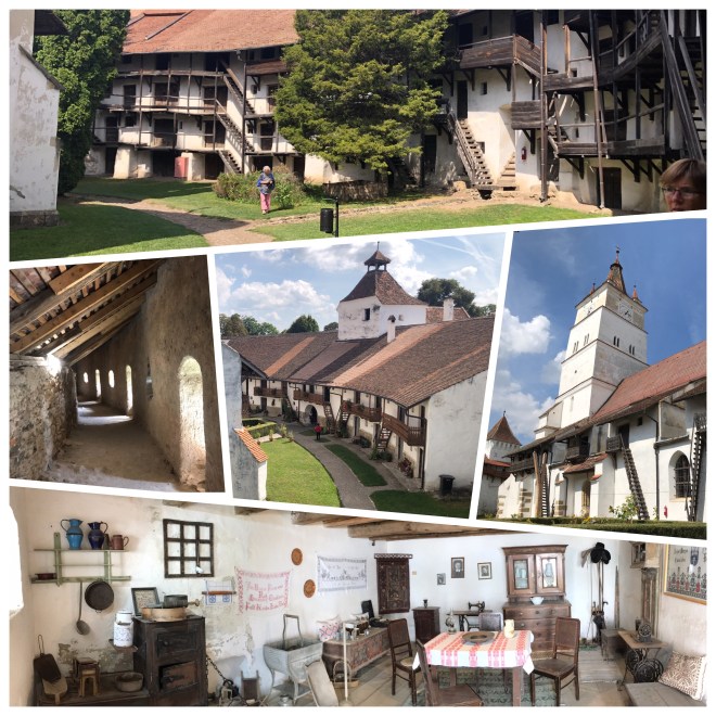 Die Wehrkirchen entstanden zum Schutz der Bevölkerung vor den Reiterheeren der Türken und Tataren im 13.-16. Jh. Bauherren waren nicht Adelige, sondern sächsische Dorfgemeinschaften. Als einzige Steinbauten im Dorf boten sich die Kirchen als Zufluchtsstätten an. Zusätzlich wurden Schutzmauern errichtet, verstärkt und ausgestattet mit Wehrtürmen, Pechnasen, Schießscharten, Falltore und Zugbrücken. In die Innenseite der Schutzmauer waren Vorrats- und Wohnkammern eingelassen. Jede Familie hatte ihre Kammer, die sie bereits zu Friedenszeiten mit Speck und anderen Vorräten füllte, denn wenn der Feind im Anmarsch war, musste es schnell gehen. Und da man unter Umständen lange ausharren musste, waren die Kirchenburgen so ausgestattet, dass hier das Dorfleben weiter stattfinden konnte: mit Brunnen, Unterrichtsräumen und Werkstätten. All das konnten wir in Harman ( Honigberg ) und Prejmer (Tartlau) besichtigen, die sich in Kriegszeiten bewährt haben.