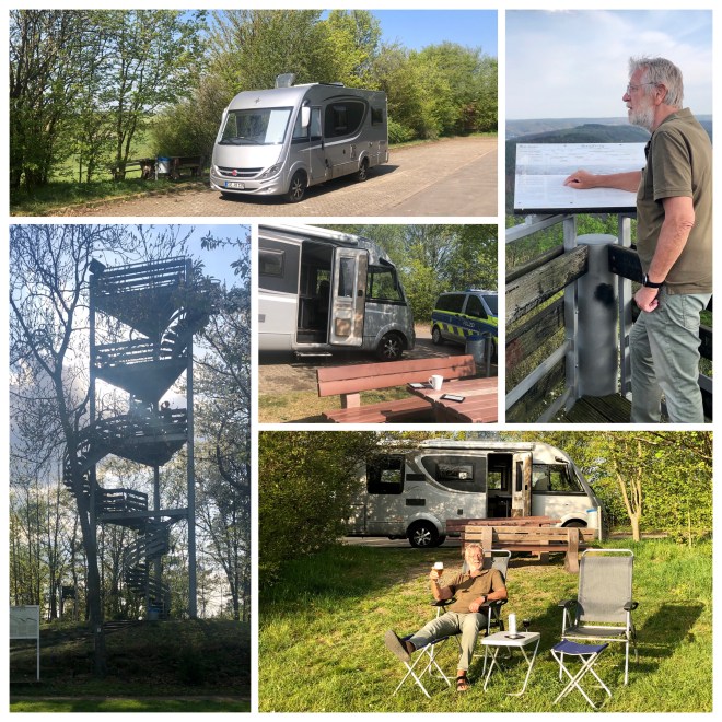 Mehrere Tage halten wir uns in Bergstein auf, wo wir wiederum schöne Wanderwege finden und vom Krawutschketurm die Aussicht auf die Rurregion genießen. Zwischendurch parkt die Polizei neben uns, grüßt, fühlt sich aber wohl nicht zuständig für uns.