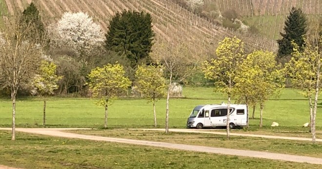Nach unserer zweitägigen Fahrt durch F suchen wir direkt hinter der Grenze Lux-D einen Übernachtungsplatz. Wir finden diesen in schöner Lage auf einem Stellplatz in Wittlich. Doch am nächsten Tag werden wir vom Ordnungsamt darauf hingewiesen, dass touristische Aktivitäten wie das Übernachten im WoMo nicht erlaubt seien. Dies gelte auch für uns, die dauerhaft im WoMo leben. Wir müssen den Platz verlassen.