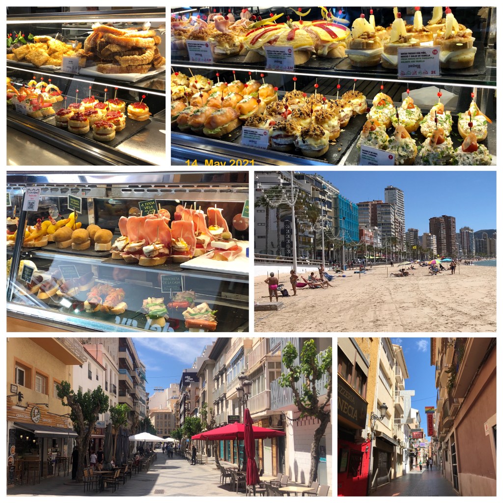 Wir bummeln durch die Altstadt und stoßen in einer Gasse auf ein nicht enden wollendes Angebot an Tapas. Leider gibt es in Benidorm keinen akzeptablen Stellplatz, so dass wir auf einen genussvollen Tapas-Abend verzichten müssen.