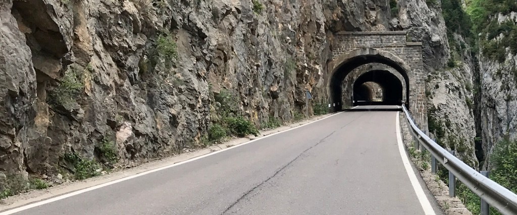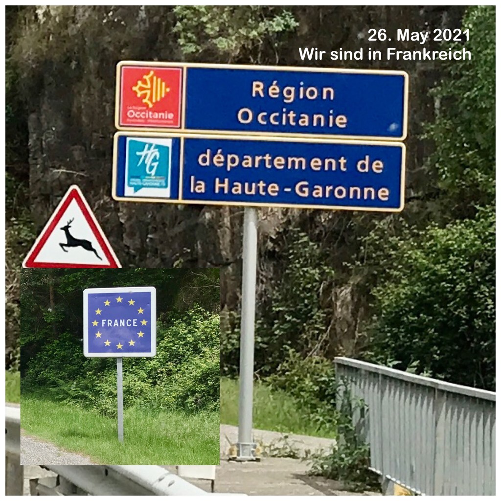 Nach Ainsa starten wir angespannt gen Frankreich und müssen an der Abzweigung zu unserer ‚ausgeklügelten’ Nebenstrecke feststellen, dass der Grenzübergang gesperrt ist. Der nächstgelegene Übergang führt über eine Nationalstraße. Genau diese Situation wollten wir vermeiden. Ein Umweg aber würde uns einen ganzen Tag kosten. Mit Herzklopfen fahren wir über die Nationalstraße weiter. Lt. französischer Pressemitteilung werden Verstöße gegen die PCR-Pflicht mit 350€/P. geahndet 😡. An der Grenze ist jedoch kein Grenzer zu sehen. Glück gehabt? Nein, hinter der nächsten Kurve erblicken wir eine Kontrollstation. Aus Herzklopfen wird Herzrasen 😥. Langsam fahren wir auf den Grenzer zu, der sich gerade mit einem Radfahrer unterhält. Der Grenzer nickt uns freundlich zu und winkt uns durch. Wir können unser Glück kaum fassen. Es dauert noch Stunden, bis sich das Adrenalin in unseren Körpern abgebaut hat😅.