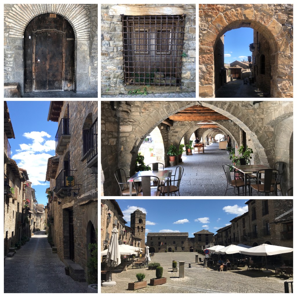 Bevor wir die französische Grenze erreichen, machen wir einen Übernachtungsstopp in dem mittelalterlichen Städtchen Ainsa in den Ausläufern der Pyrenäen. Eigentlich sind es nur zwei Straßen, die Calle Mayor und die Calle Santa Cruz, die durch die denkmalgeschützte Altstadt hinauf zum zentralen Platz Plaza Mayor verlaufen. Der Weg führt vorbei an alten Steinhäusern mit schmiedeeisernen Gittern vor Fenstern und Türen sowie kleinen, geschmückten Balkonen. Auf dem historischen Platz gönnen wir uns vor der tollen Kulisse einen Sundowner und verbringen auf einem netten Stellplatz für 3€ eine ruhige Nacht. Ein Dank an die Stadt Ainsa! Nur wenige Städte empfangen WoMos mit diesem Komfort.