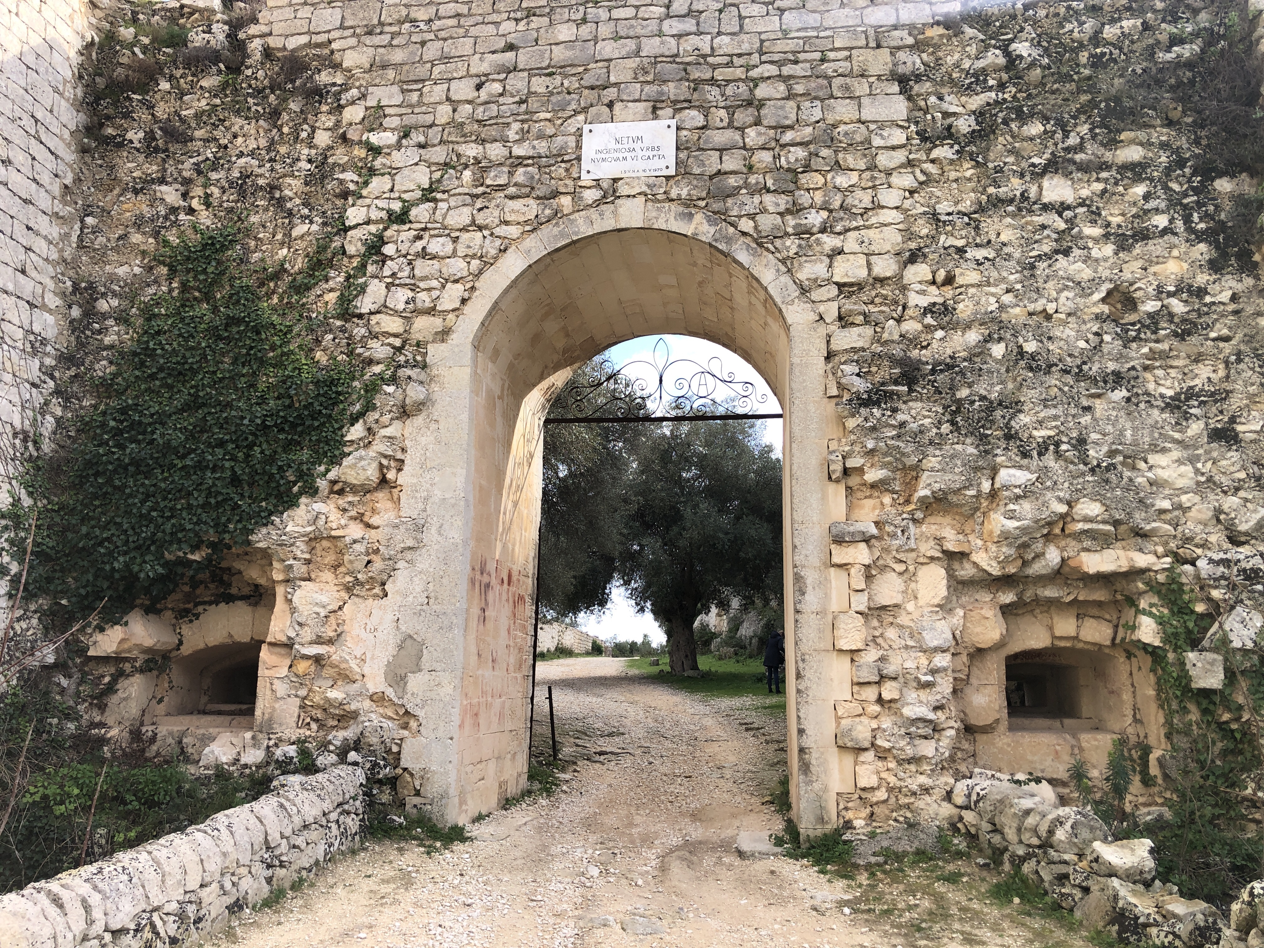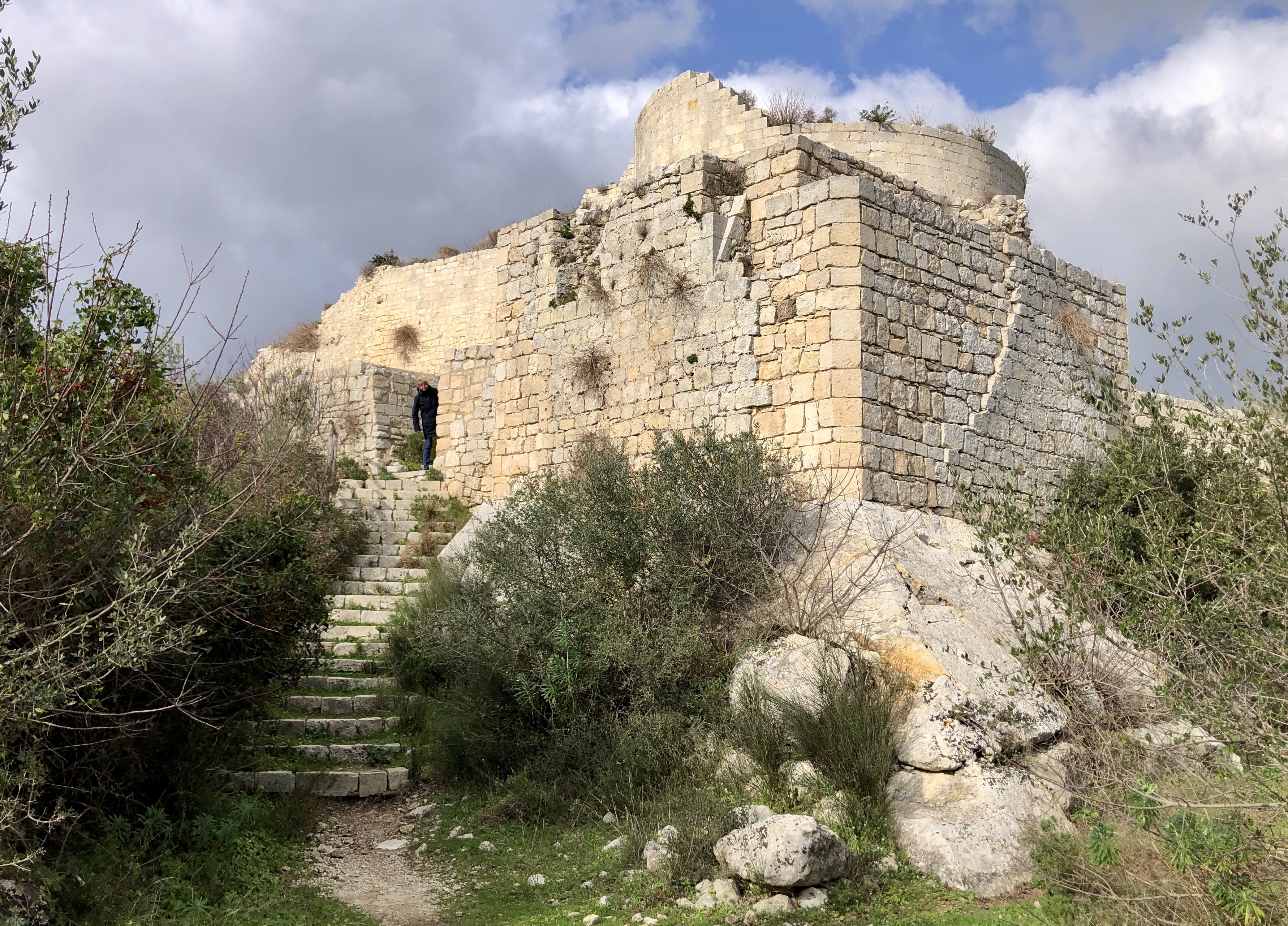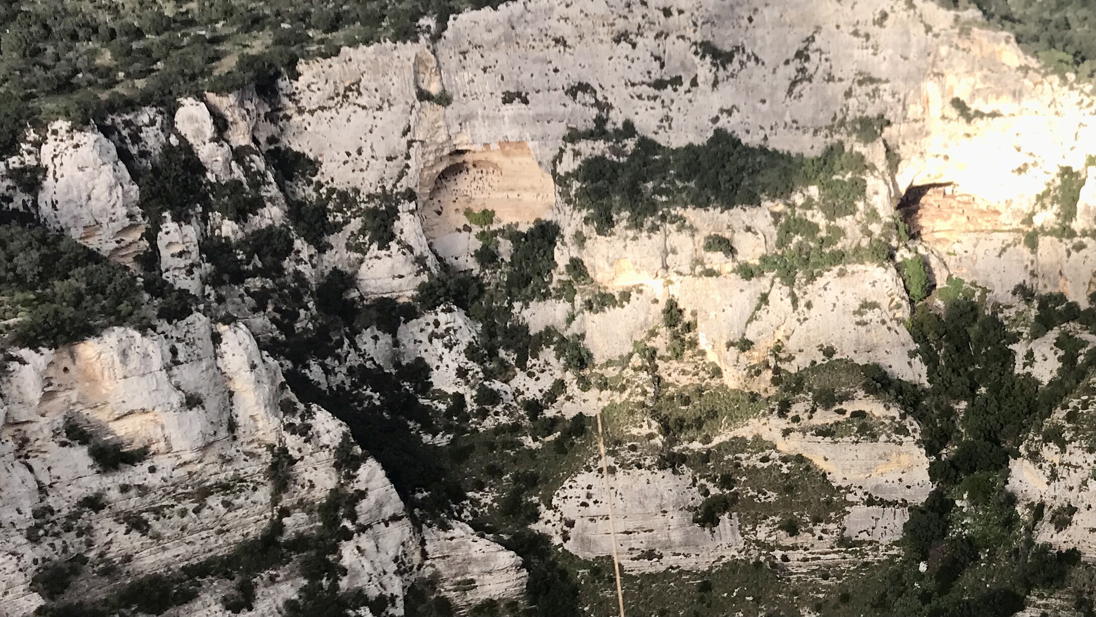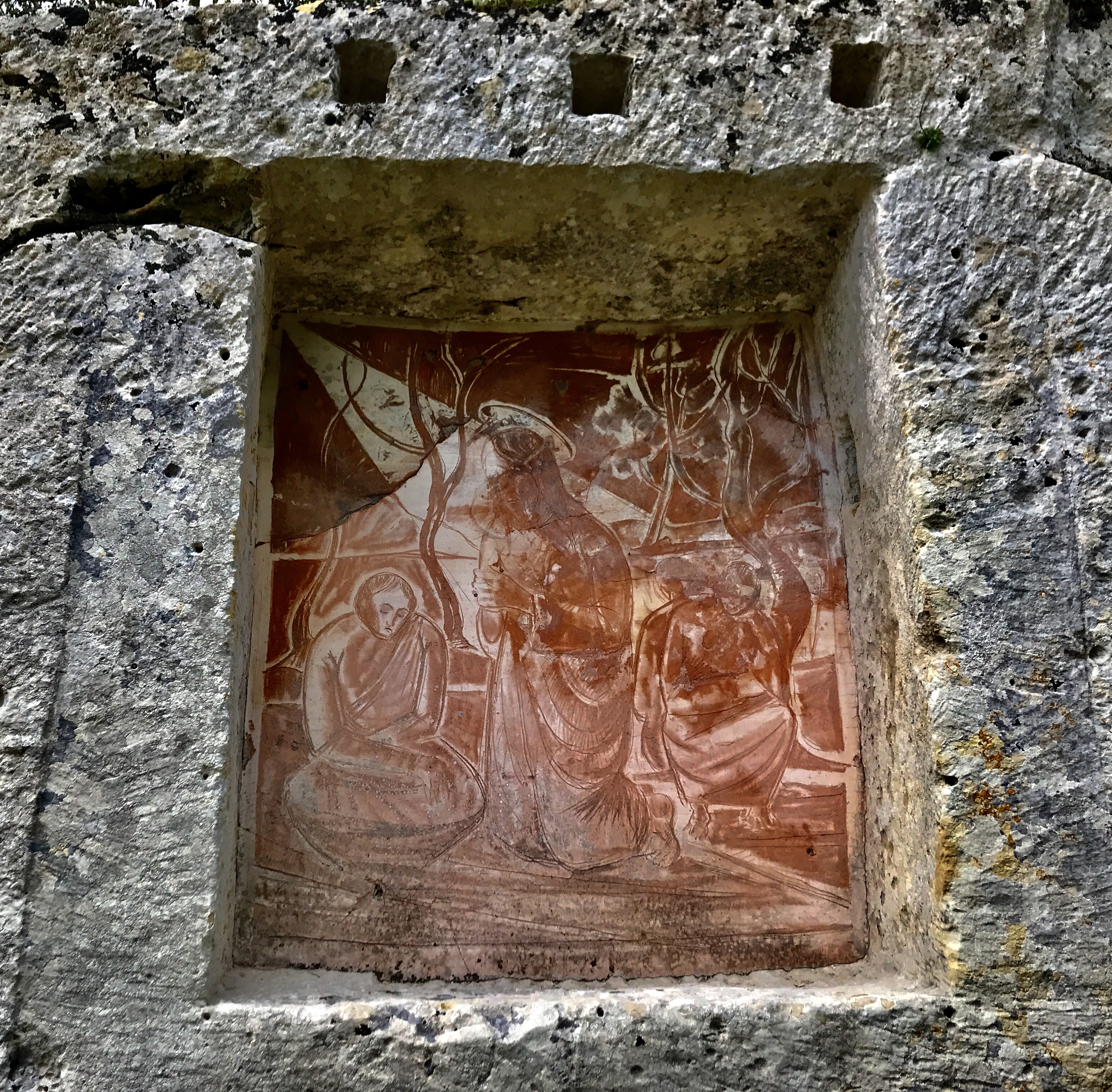 Auf der gegenüberliegenden Seite der Schlucht sind in den steilen Felswänden Grabhöhlen zu sehen, die aus dem 12. bis 8. vorchristlichen Jahrhundert stammen. Die Nekropole hat eine ähnliche Geschichte wie die Totenstadt Pantalica in der Nähe von Siracusa, siehe Blogeintrag vom Januar 2020, und gehört zu den bedeutendsten bronzezeitlichen Zeugnissen auf Sizilien.