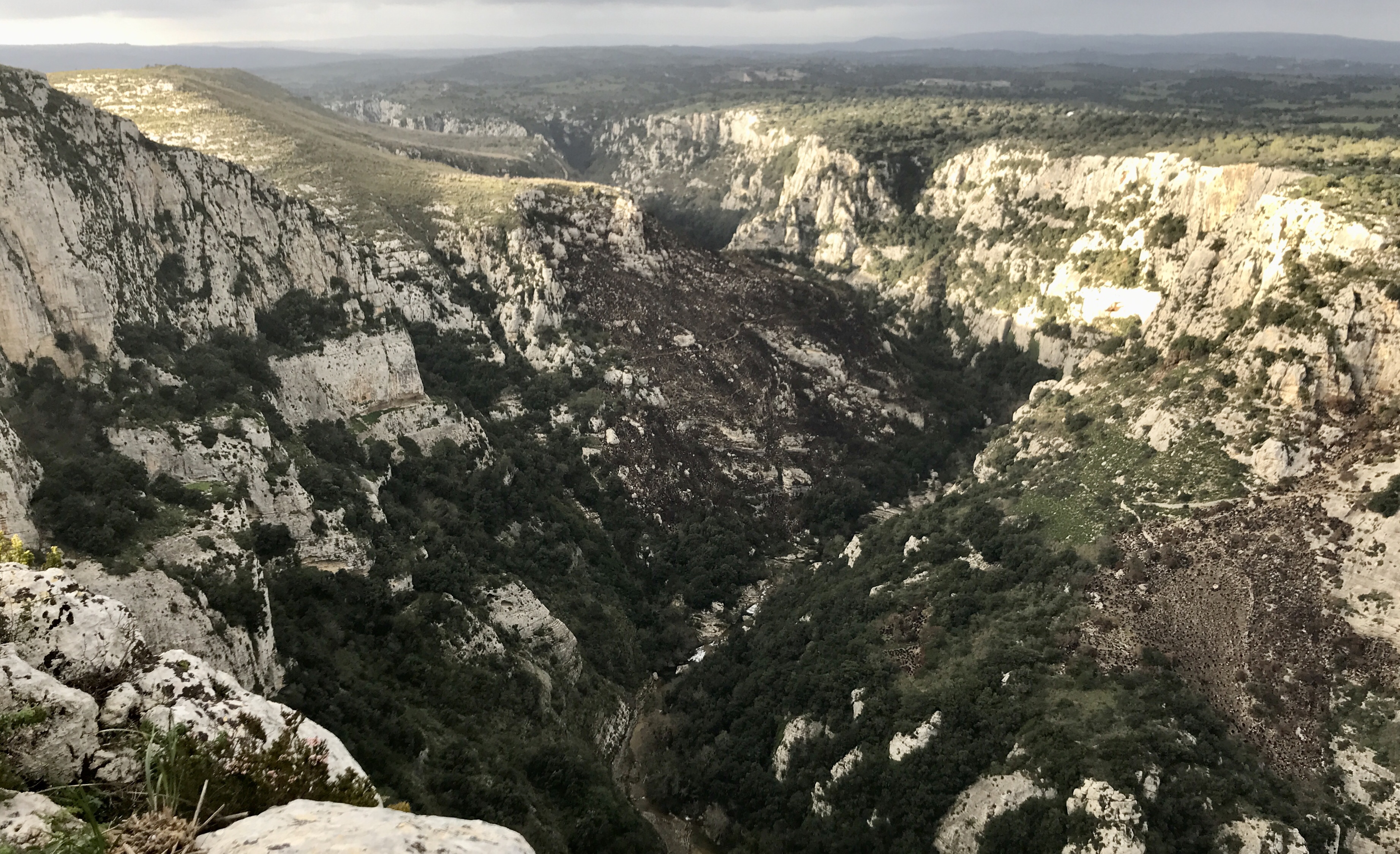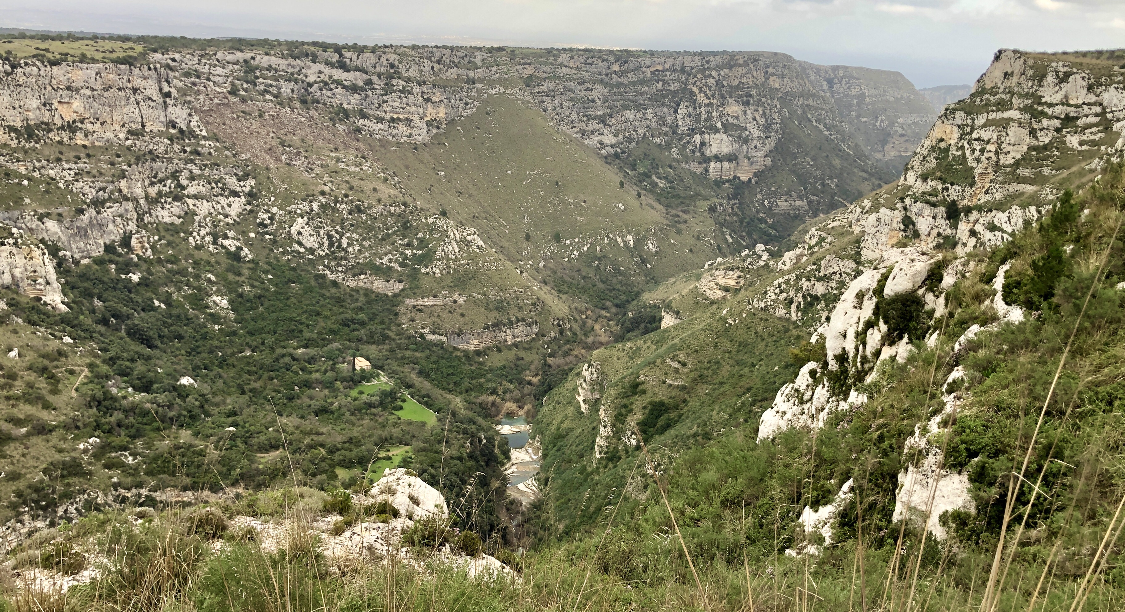 Bei unseren Recherchen im Internet stoßen wir auf die Schlucht Cava Grande del Cassibile, den sizilianischen Grand Canyon. Von Avola aus geht es in die Berge über eine gut ausgebaute Serpentinenstraße. Auf einem Plateau bieten sich atemberaubende Aussichten hinunter in die Schlucht und über das weitläufige Hinterland. Der Abstieg über unzählige Treppenstufen ist leider 🙁 gesperrt.