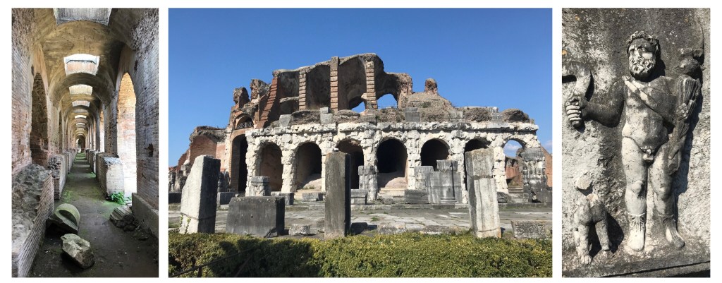 Es ist das zweitgrößte römische Amphitheater nach dem Kolosseum in Rom. Auch wenn Plünderungen in den folgenden Jahrhunderten dem Amphitheater in Capua sehr zugesetzt haben, genießen wir die Zeit in der Ruine. Wir sind die einzigen Besucher und können auch die Unterbauten ausgiebig inspizieren.