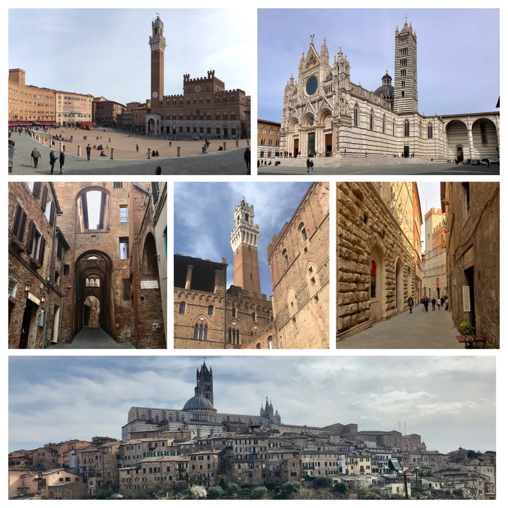 Besonders beeindruckt uns die Piazza del Campo (links oben), ein von eleganten Häusern und Palazzos umgebener mittelalterlicher Backsteinplatz, der vom 87 m hohen, viereckigen Steinturm Torre del Mangia (1348) überragt wird. Der Platz ist jährlich Schauplatz des Pferderennens Palio di Siena. Im Juli und August verwandelt sich der weitläufige Platz im Zentrum von Siena in eine Pferderennbahn, bei dem die Stadteile Sienas hoch zu Ross gegeneinander antreten.