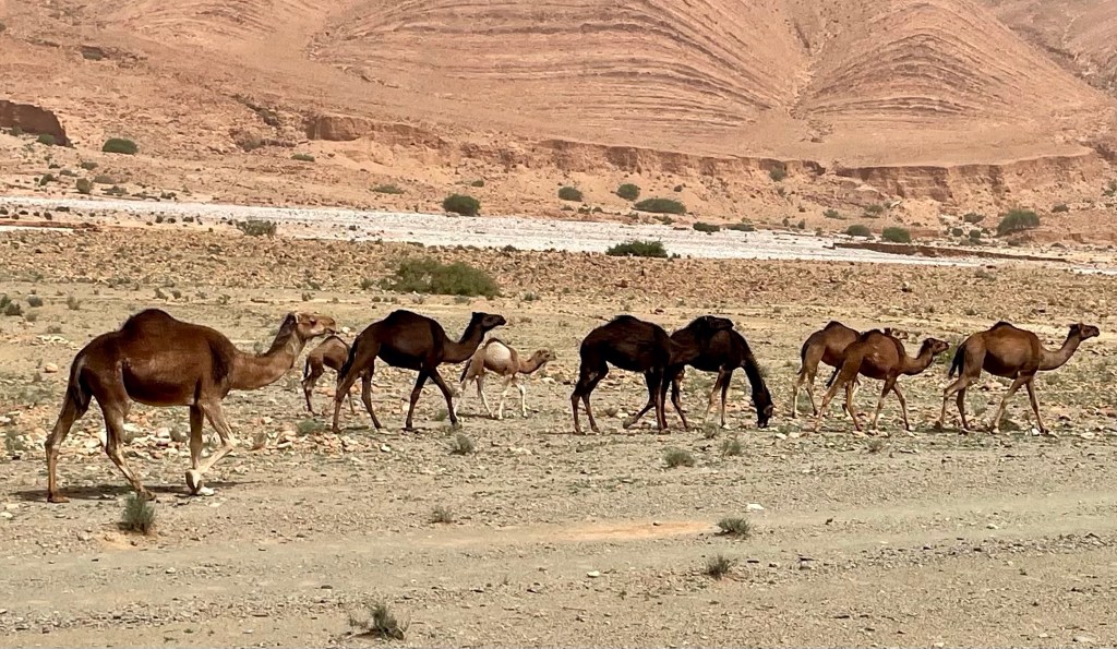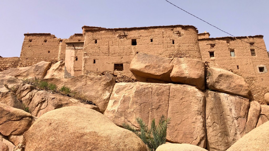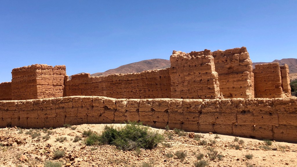 Wir aber erleben kaum noch intakte Oasen. Dürre und Brände häufen sich und zerstören den Lebensraum Oase. Viele der ursprünglich hier lebenden Chleuh-Berbern sind in die städtischen Zentren Marokkos abgewandert. Die traditionellen Dörfer („Ksar“ bzw. „Kasbah“ in der Einzahl), gebaut aus Stampflehm und umgeben von Lehmmauern, verfallen. Daneben stehen häufig große, nicht immer vollendete Neubauten, finanziert aus den Einnahmen in der Stadt. (Bekanntermaßen gelingt der Neustart in der Stadt nicht allen. Wir haben an den Rändern der großen Städte auch slumähnliche Siedlungen gesehen.)