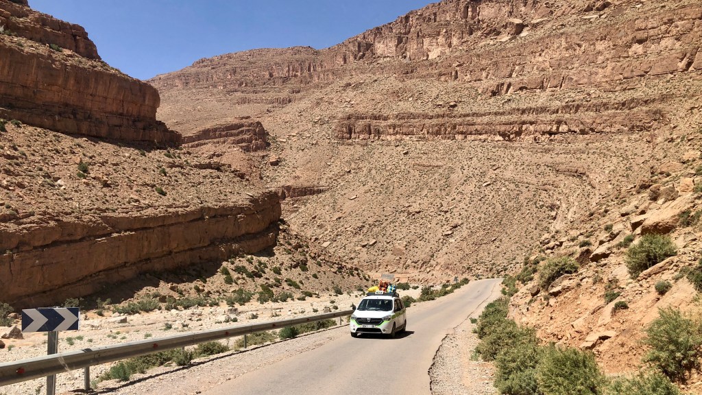 Nach einer Übernachtung mit Essensservice auf dem Parkplatz eines Hotels auf 2400m Höhe können wir gen Süden die Todra-Schlucht durchqueren.